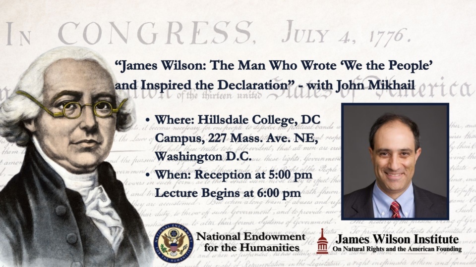 Beginning at 6pm, Prof. John Mikhail will offer a lecture on JWI's namesake in honor of the 250th anniversary of American independence: James Wilson is the only founder to sign both the Constitution and the Declaration of Independence and to serve on the U.S. Supreme Court. He wrote the first complete draft of the Constitution and, in that capacity, he crafted many of its most significant clauses and phrases, including the Vesting Clauses, the Necessary and Proper Clause, the Supremacy Clause, and the majestic opening words of the Preamble: "We the People." One of the best legal minds of his generation, Wilson has also been called the "most democratic" founder because of his support for popular sovereignty and the principle of one person, one vote. While these facts about Wilson are well-known, Wilson's role in inspiring the Declaration of Independence is less familiar. This lecture will discuss that influence, explaining how Wilson's novel synthesis of natural law and aspects of the British Constitution helped pave the way for the theories of natural rights, government by consent, and national identity presupposed by the Declaration of Independence.