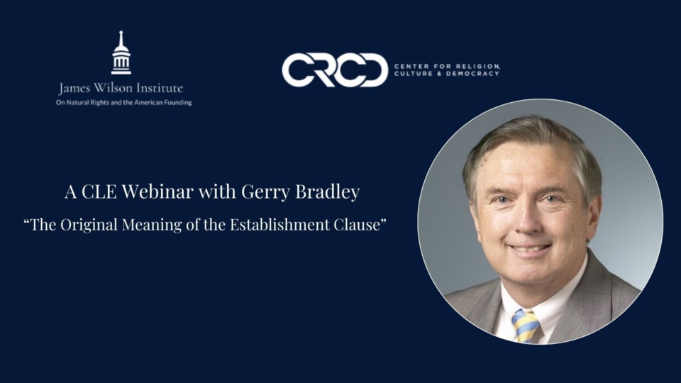 Join us on Tuesday, Febuary 20th for the next installment of the James Wilson Institute and Center for Religion, Culture, and Democracy's ongoing webinar series. Prof. Gerard Bradley of the University of Notre Dame Law Schoool will deliver a webinar on The Orignial Meaning of the Establisment Clause. As part of this series, we will be applying for CLE Ethics Credit in Virginia and Texas for this webinar.